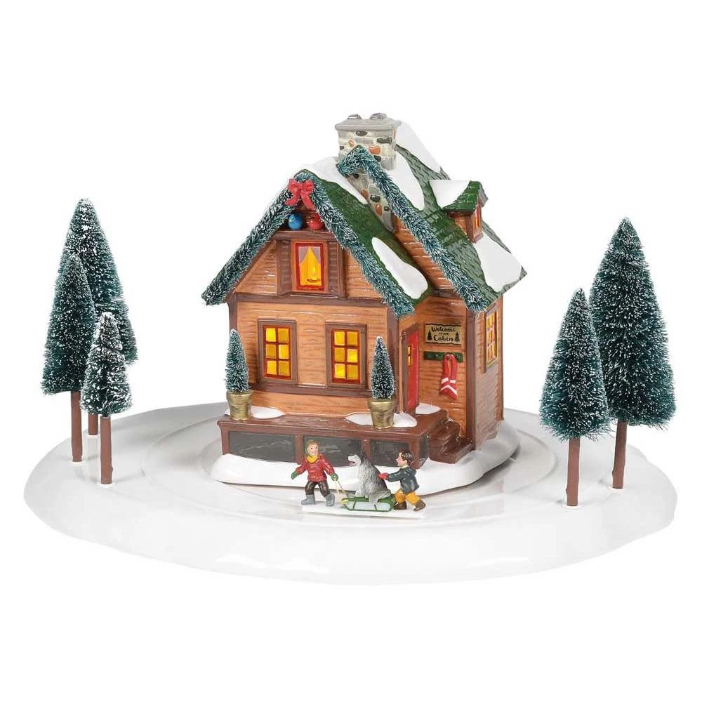 A thick blanket of fresh snow covers the yard, making the perfect day for sledding.ย Our sled dog friend takes a break and enjoys a ride around the cabin, beneath the snow-covered pines. Inside, the warm glow of the cabin and a candle in the upper window welcomes the kids to take a break and come in for some hot cocoa.